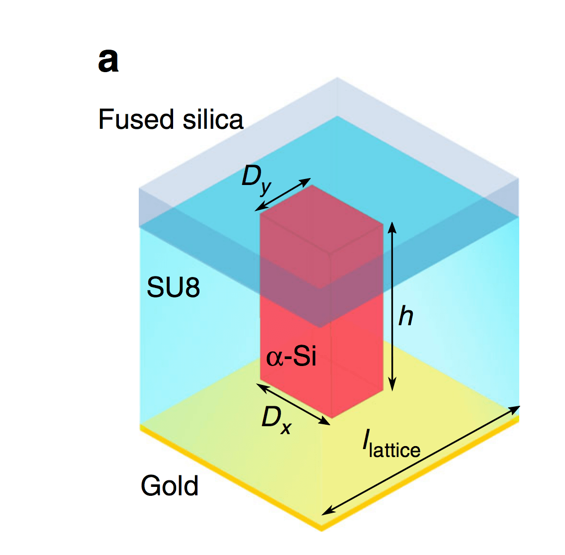 Each of the meta-atoms consisted of a rectangular α-Si nano post, capped by a 2-μm-thick SU-8 layer, and backed by a gold mirror. The post height and lattice constant were 395 and 246 nm, respectively. These values were chosen accordingly to achieve full 2π phase coverage while minimizing the variation of the reflection phase derivative across the band. By decreasing the wavelength dependence of the phase profiles, minimizing the phase derivative variation will mitigate the reduction of device efficiency over the bandwidth of interest.