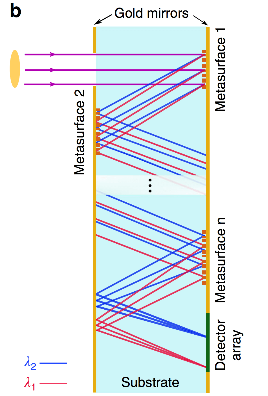 But a team of researchers from California Institute of Technology (Caltech), have introduced the concept of folded metasurface optics. They experimentally demonstrated a compact spectrometer made from a 1-mm-thick glass slab and the designed spectrometer has a resolution of ~1.2 nm. A paper describing their work was published in the journal Nature Communication, on 10 October 2018.