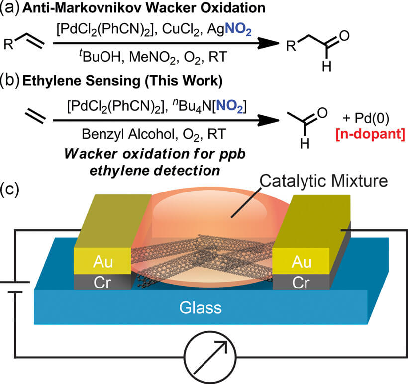 First, they tried to mimic the plants themselves, which use copper ions to promote ethylene activity. But as plants have a natural ability to keep copper in its Cu(I) oxidation state - which has one fewer electron than the material would have as a neutral atom - this process proved to a more convoluted process. Therefore, in a synthetic device, copper tends to exist in the Cu(II) oxidation state, and preventing Cu(I) from oxidizing to Cu(II) proved too difficult for this approach to have commercial potential. However, in the Wacker reaction, ethylene oxidation is catalyzed by palladium in the Pd(II) state, and, from the study, this is more stable than Cu(I). Using this process, they found that the resulting ethylene reaction surrenders electrons that reduce Pd(II) to the n-dopant Pd(0), which the highly sensitive CNTs should announce with a dip in conductivity from the excess electrons.