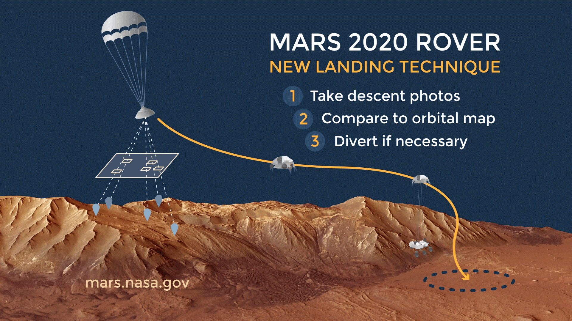 Using images from Mars orbiters, the mission team first creates a map of the landing site. The rover stores this map in its new computer memory that is designed specifically to support Terrain-Relative Navigation. While descending on its parachute, the rover takes pictures of the fast-approaching surface. To figure out where it's heading, the rover quickly compares the landmarks it sees in the images to its onboard map. Armed with the knowledge of where it’s heading, the rover searches another onboard map of safe landing zones to find the safest place it can reach. The rover can avoid dangerous ground up to about 1,100 feet (335 meters) in diameter and diverts itself toward the safer ground and avoid hazardous terrain.
