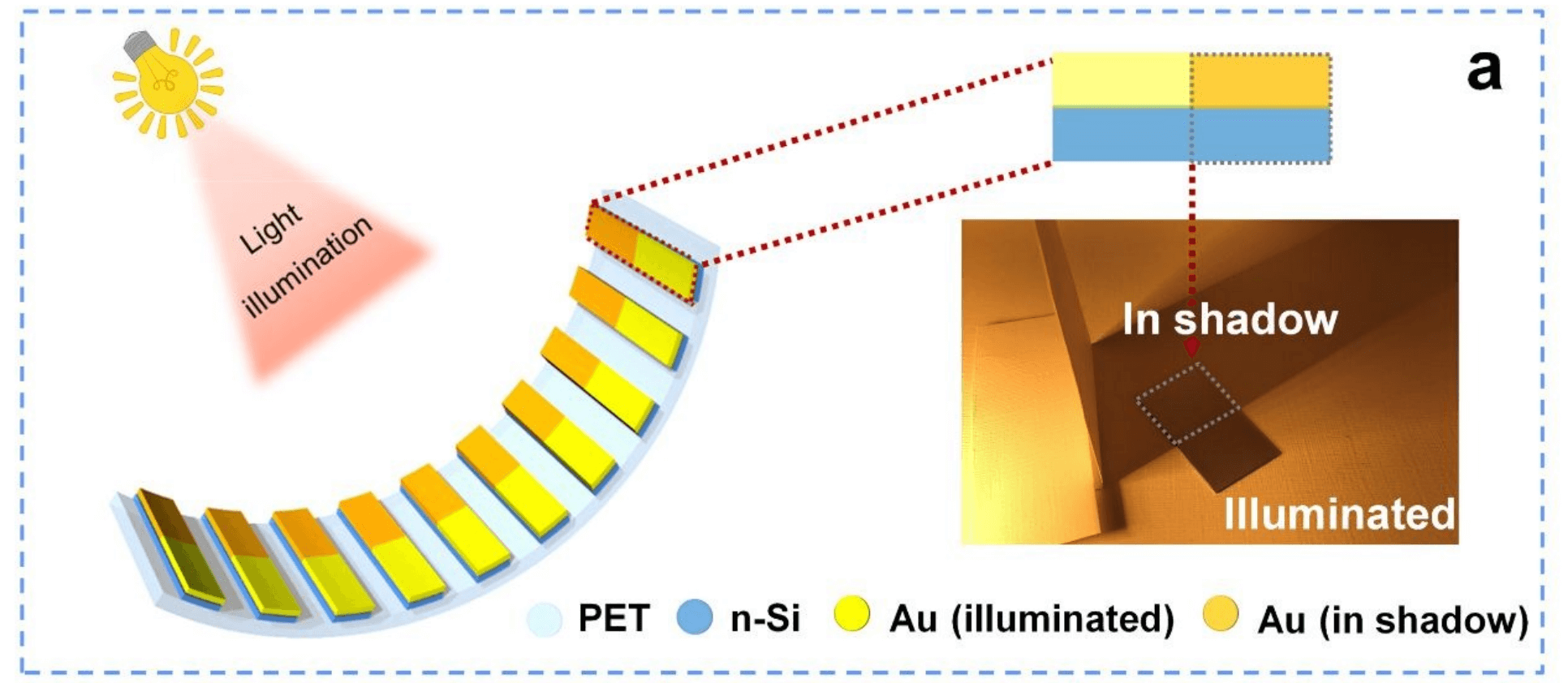 Regarding the working principle of this newly designed SEG, researchers explained that the work function of Au is higher than that of the n-type Si and due to this difference in their work function, free electrons flow from n-Si to Au in the shadowed contacted regions of Au and n-Si. This electron transfer between Au and n-Si will continue until the Fermi levels of Au and n-Si are aligned. Now under equilibrium, a depletion region will be established and upon illumination, the absorption of photons with energy higher than that of the bandgap creates electron-hole pairs via a band to band transition.