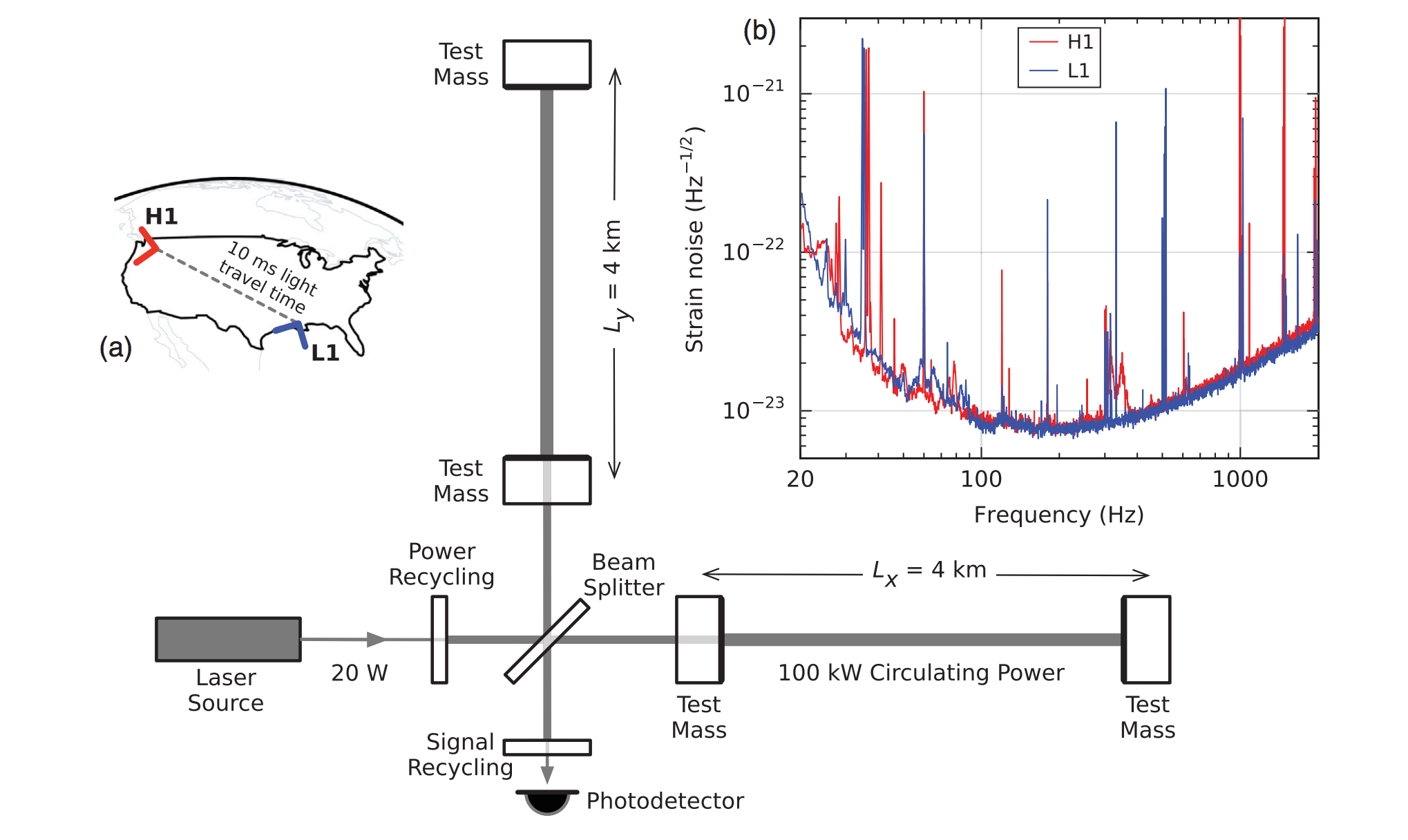 As the name suggests, Advanced Laser Interferometer Gravitational-Wave Observatory (aLIGO/LIGO) basically works on the principle of the interferometer, a modified Michelson interferometer. Each aLIGO observatories consists of two, vacuum, 4 KM long, arm-like structure, and each arm is attached by mirrors at the respective ends. Here, the mirrors act as a test mass. If an observatory detects the gravitational wave then arm lengths will be altered and the difference is calculated by ΔL(t) = δLx − δLy = h(t)L, where h is the gravitational-wave strain amplitude projected onto the detector. Thus produced a variation of differential length alters the phase difference between the two light fields that are returning to the beam splitter. This phase difference transmits an optical signal proportional to the gravitational wave strain to the output photodetector.