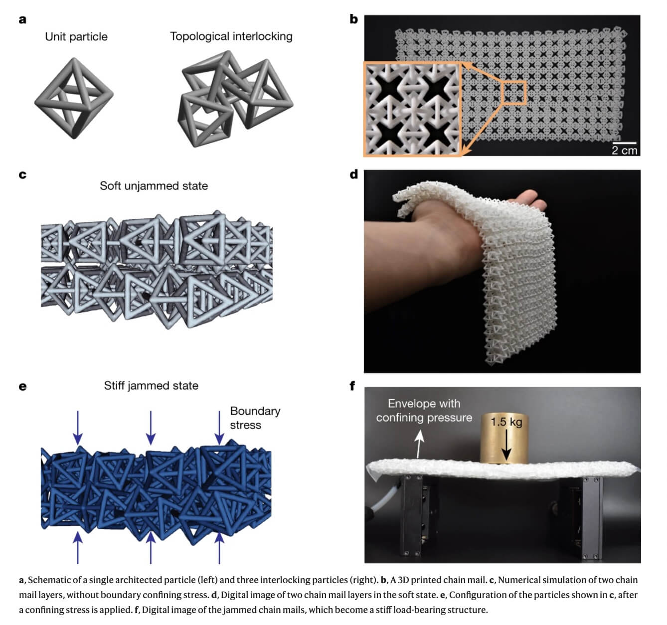 The team demonstrated structured fabrics with tunable bending modulus, consisting of three-dimensional particles arranged into layered chain mails. The basics idea is, the chain mails conform to complex shapes, but when pressure is exerted at their boundaries, the particles interlock, and the chain mails jam.