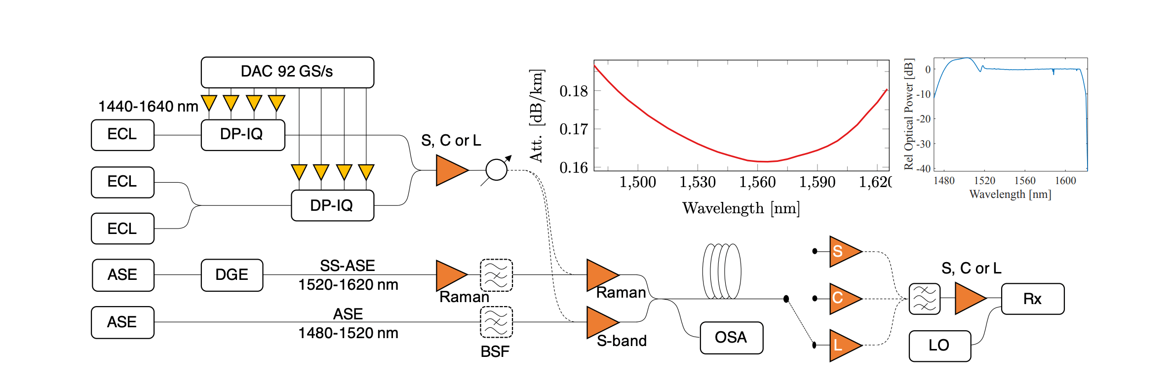Here the team used a combination of discrete Raman amplifiers with a continuous gain bandwidth of 1520.00 - 1619.67 nm, together with a thulium-doped fibre amplifier (TDFA) of 1484.86 - 1520.00 nm gain bandwidth. Raman amplifier makes the use of stimulated Raman scattering (SRS) within the fibre and transfers the energy of higher-frequency pump signals to lower-frequency signals.