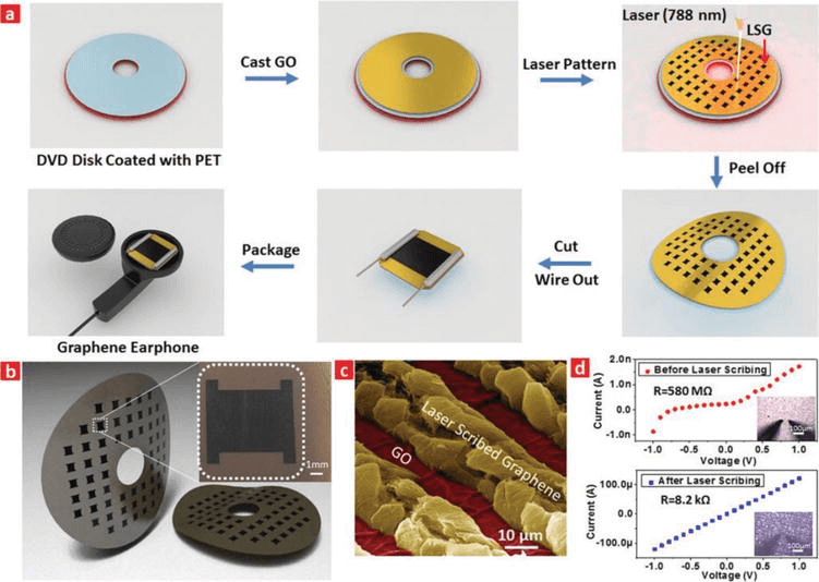 This team used the laser scribing method to prepare graphene due to its advantage of low cost and high speed. The earphone based on laser scribed graphene (LSG) can cover audible range and ultrasonic range.