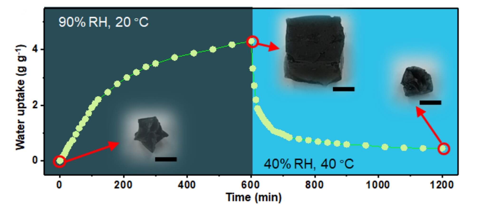The SMAG can liquefy moisture of ∼4 g water per gram of corresponding fully dried sample at 90% relative humidity (RH). It can also release liquid water without ionic solutes that may break the osmotic balance of plant roots when being heated to ∼35 °C because of its interpenetrating polymer network composed of hygroscopic polypyrrole and thermoresponsive poly(N-isopropylacrylamide).