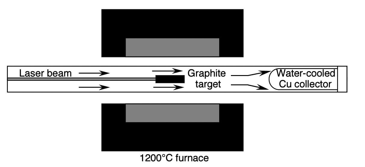 A graphite target is placed in the middle of a long quartz tube mounted in a temperature controlled furnace where temperature on furnace will reached up to 1200 ◦C. The tube is then filled with a flowing inert gas and a scanning laser beam is focused onto the graphite target by way of a circular lens. It contains a conical water-cooled copper collector where the carbon species produced by vaporization and swept by flowing gas will be deposited.