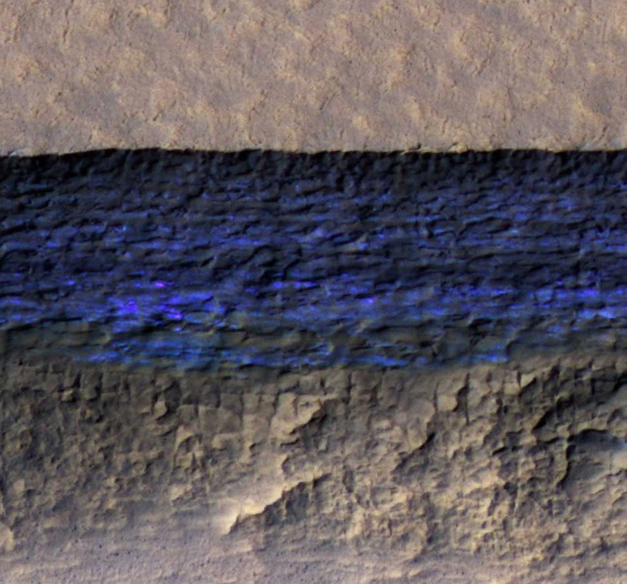 Water ice has been detected below the surface on Mars within soil scooped up at the Phoenix landing site, as well as from orbit using radar measurements, and using neutron and gamma-ray spectroscopy. More recently, HiRISE has captured views of this near-surface ice at mid-latitudes.